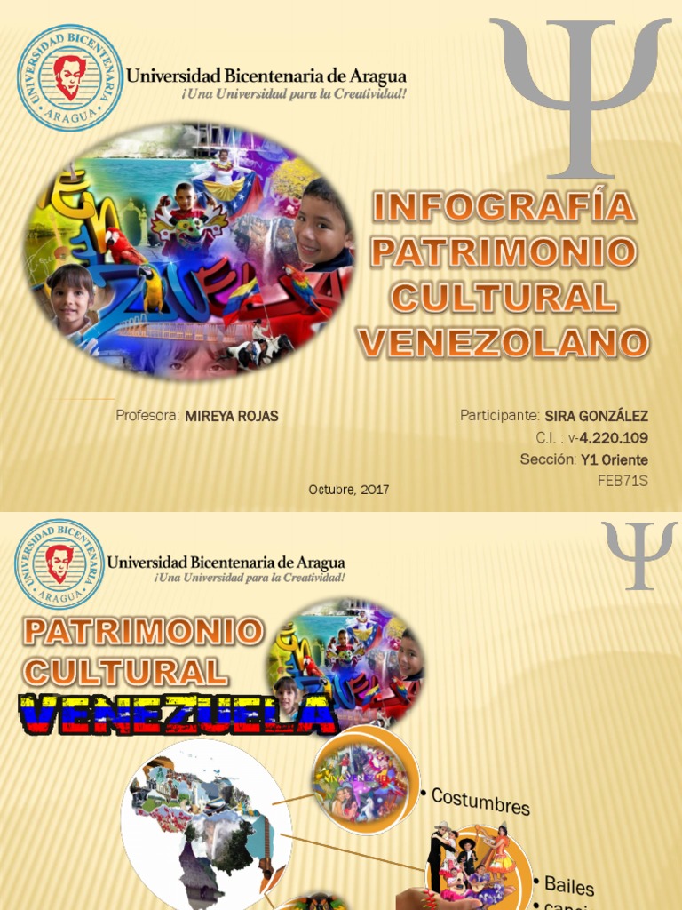 .el día del patrimonio cultural en venezuela, según el decreto 2956 publicado en la gaceta oficial número 37.955, del año 2004, en homenaje al natalicio de francisco de miranda, prócer de nuestra independencia y pionero en la defensa y conservación del patrimonio cultural de la humanidad. El presidente de la república bolivariana de venezuela, nicolás maduro, felicitó a los devotos de san antonio de padua por la celebración del día del tamunangue larense, patrimonio cultural de venezuela. Jheferson garcía zulexy montes de oca thaimar crespo naibeth ramos sección: Nuestros patrimonios culturales y naturales son irremplazables fuentes de vida e inspiración». Patrimonio cultural de venezuelarealizado por:cindy vegapedro nietoronny nietouniversidad bicentenaria de araguacontaduría t2docente: