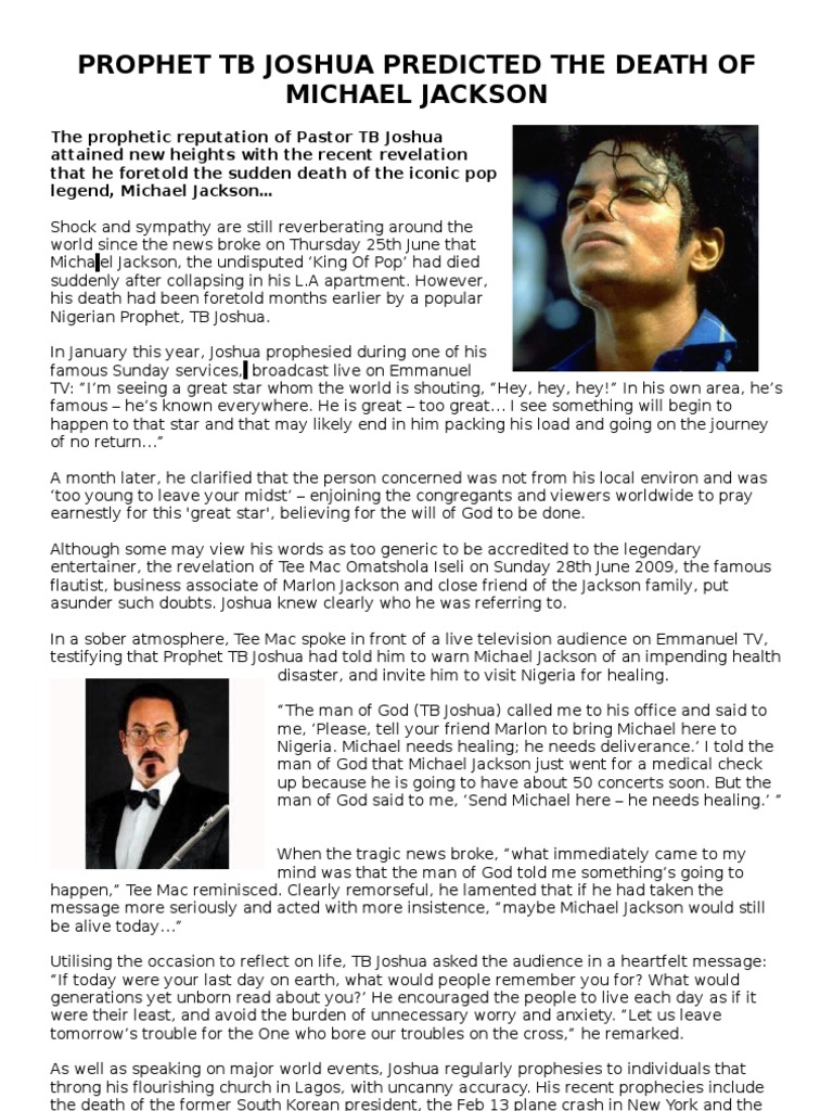 The facebook page revealed that tb joshua had foretold his death in his last sermon. This video is about a popular nigerian prophet, t. Tb joshua ministries has announced the passing of prophet tb joshua, founder of the synagogue church of all nations, scoan. The page quotes amon 3 verse 7 surely the sovereign lord does nothing without. He was 57 years old at the time.